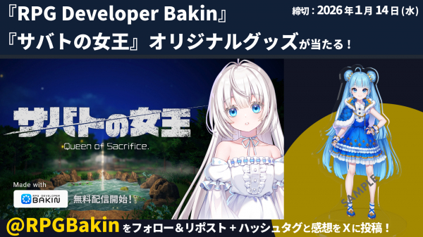 Bakinの公式Xアカウントをフォローして、キャンペーンの投稿をリポストすると、抽選で3名様に『RPG Developer Bakin』をプレゼントします。さらに、感想やスクリーンショットなどに2つのハッシュタグをつけてXに投稿すると、抽選で10名様に『RPG Developer Bakin』と『サバトの女王 Queen of Sacrifice.』オリジナルグッズをプレゼントいたします。