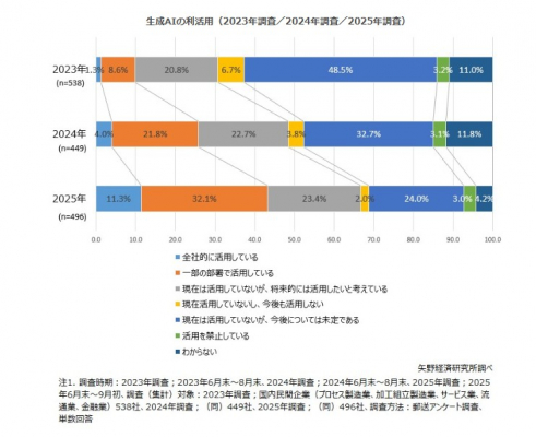 2023年調査(調査時期:2023年6月末~8月末、調査(集計)対象:国内民間企業(同)538社、調査方法:郵送アンケート)では「全社的に活用している」1.3%、「一部の部署で活用している」8.6%であり、利用率は1割未満であった。2025年調査では利用率が4割を超えており、わずか2年で企業における生成AIの利用は急速に拡大した。近年のITトレンドの中でも浸透の速度は異例であり、生成AIが企業の業務に取り込まれつつある状況にあるとみる。