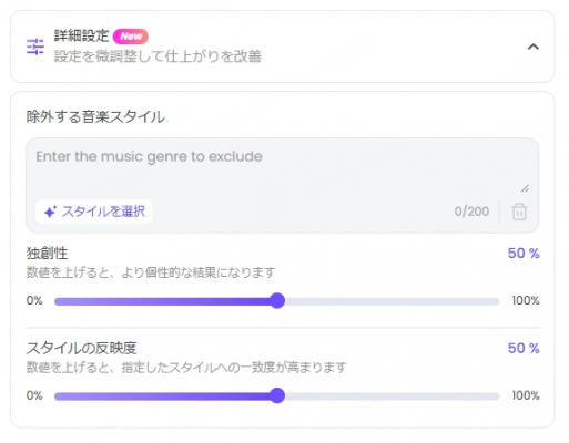 「詳細設定」をクリック、「除外する音楽スタイル」、「独創性」、「スタイルの反映度」などを設定。