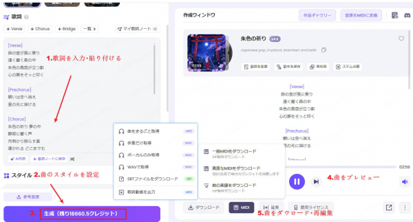 生成された楽曲をダウンロード、MIDI/楽譜としてエクスポート可(必要に応じて編集)
