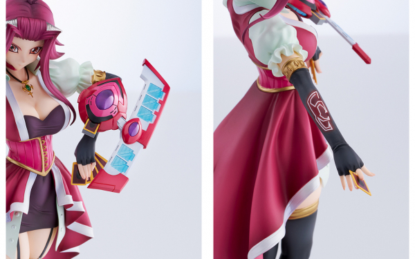 アキのイメージとも言える赤い衣装やコルセット、首元のアクセサリーや髪留め等、特徴的な衣装をしっかりと再現。彼女専用のデュエルディスクの造形はもちろん、シリーズ共通で周るモーメントの光をイメージした彩色を施しています。
