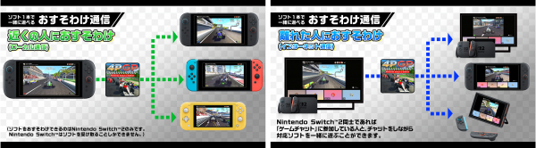 -近くの人におすそわけ(ローカル通信): Nintendo SwitchTM2/Nintendo SwitchTM本体が複数あれば、ローカル通信で「おすそわけ通信」が可能。ソフト1本で、ソフトを持っていない人におすそわけしてみんなで一緒にプレイすることができます。(ソフトをおすそわけできるのはNintendo SwitchTM2のみです。 Nintendo SwitchTMはソフトを受け取ることしかできません。)