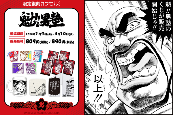 フィジカルグッズのオンラインくじ「カワセルくじ」にて、大好評を博しながらも限定期間での販売を終了した『魁!!男塾』のくじが、再販を要望するファンの声を受けて、待望の【復刻再販】です。
