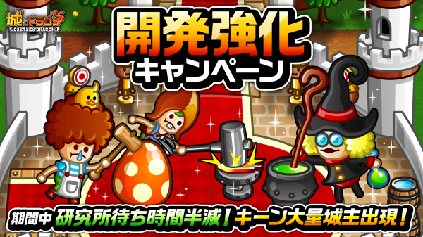 武具・スキルの研究開発やタマゴのふ化など「研究所」に関わる全ての所要時間が通常の半分になる「研究所待ち時間半減キャンペーン」を開催中。さらに、敵城を攻め落とす「攻撃」の全モード(ひとりで/みんなで)を対象に、大量の“キーン”を持った城主が出現することがある「キーン大量城主出現キャンペーン」を開催中です。