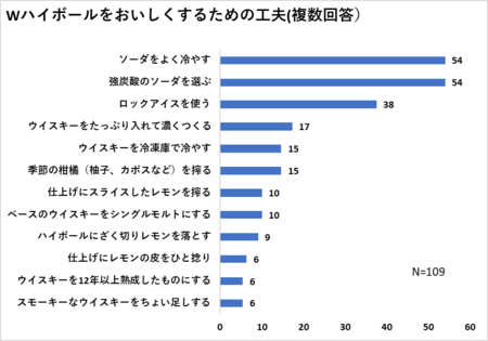 そのほかにあげられた工夫を見ると、濃さやベースウイスキーにこだわる意見が人気です。「ウイスキーをたっぷり入れて濃くつくる」( 17 %)、「ベースウイスキーをシングルモルトにする」( 10 %)、「ウイスキーを 12 年以上熟成したものにする」( 6% )などです。