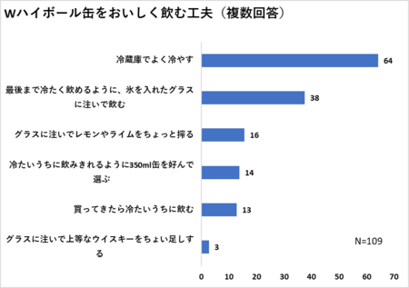 缶入りの製品をおいしく飲む工夫では、「冷蔵庫でよく冷やす」が64%と圧倒的に多くあげられました。そして「最後まで冷たく飲めるように、氷を入れたグラスに注いで飲む」とひと手間かける工夫が38%にのぼりました。「冷たいうちに飲み切れるように350ml缶を好んで買う」という意見も14%あります。 そのほか缶入りのハイボールでもレモンやライムを搾るという意見も16%あります。