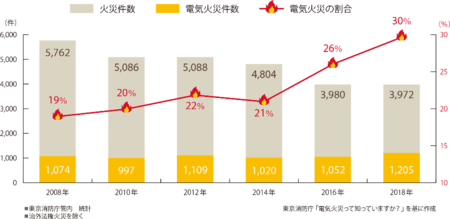 火災全体の発生件数は減少傾向にありますが、電気火災の防止には有効な手段がなく毎年1,000件を超え、火災全体の30%を占めています。