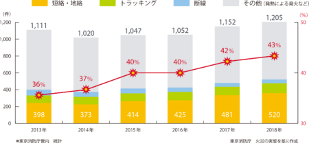 短絡・地絡、トラッキング、断線などによる火花が原因となり、火災に至るケースが毎年電気火災全体のおよそ40%を占めています。