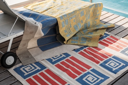 キリムと呼ばれるラグの仲間FLAT WEAVEが6柄とバイナル・フロア(塩ビ床材)FLOOR CLOTHSが6柄で構成されたコレクション。手軽な価格でライトの世界観をインテリアに取り入れられます。100%コットンのFLAT WEAVEはひとつひとつインドで手編みされており、もはや芸術作品と言っても過言ではないキリムです。FLOOR CLOTHSはリビングルーム、廊下、玄関などに敷いて頂くのはもちろんのこと、壁などに貼ってもフランク・ロイド・ライトのデザインをお楽しみ頂けます。