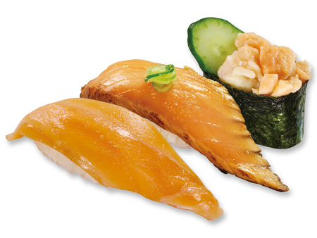 サーモンとろ三種盛り (サーモン腹とろ、サーモン背とろたたき、サーモンとろ軍艦) 200円(税込220円) 販売期間:4月10日(金)~4月16日(木)