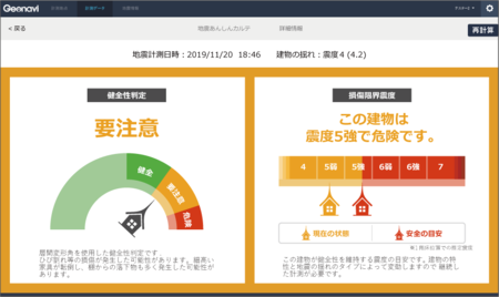 ※3 地震の揺れの後『地震あんしんカルテ』が表示されます。これは、計測した加速度を用いて等価一質点解析モデルにより建物への揺れの 影響を推定するツールで、結果を断定するものではありません。第三者機関と検証中のツールであり、現在利用できるのは低層建物に限ります(大スパン構造など特殊な建物を除く)。
