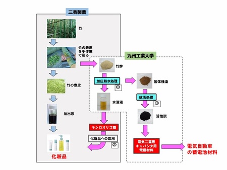 国立大学法人 九州工業大学(本部:福岡県北九州市 学長:尾家祐二、以下「九工大」)と、美容成分の開発・製造・販売を行う美白成分のパイオニア、三省(さんしょう)製薬株式会社(本社:福岡県大野城市 代表取締役社長:陣内宏行)では、2020年4月15日より、竹から段階的に「化粧品の美容成分」と「電気自動車用の蓄電デバイスの電極材料」を製造・事業化することを目指す産学連携の共同研究プロジェクトを本格スタートいたします。