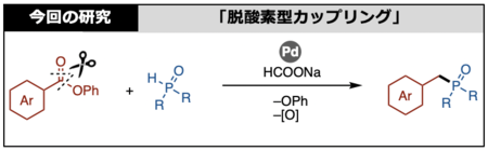 今回の研究では、パラジウム触媒と温和な還元剤であるギ酸ナトリウムを用い、エステル化合物と有機リン化合物を反応させることで芳香族エステル(ArCOOPh)からカルボニル部位(CO)の酸素原子とフェノール部位(OPh)を取り除き有機リン化合物と繋げる「脱酸素型カップリング」が進行することを見出しました。芳香族エステルをベンジル化剤として用いる今までに無い形式の反応です。