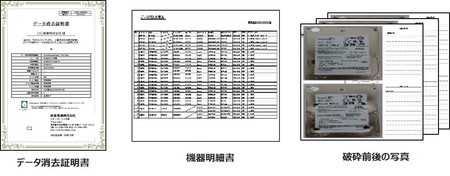 ハードディスクデータ消去後、消去方式による『消去証明書』『機器明細書』『破砕した媒体の写真』など消去成果物を発行いたします。