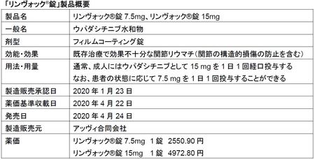 アッヴィ合同会社(本社:東京都港区、社長 : ジェームス・フェリシアーノ)は、既存治療で効果不十分な関節リウマチ(関節の構造的損傷の防止を含む)の治療薬として、ヤヌスキナーゼ(JAK)阻害剤、リンヴォック(R)錠(ウパダシチニブ水和物)「以下、リンヴォック(R)」を本日、4月24日から発売します。リンヴォック(R)は低分子のJAK阻害剤で、1日1回投与の経口薬剤です。リンヴォック(R)は中等度から重度の関節リウマチ患者さんにとって、csDMARDとの併用または非併用に関わらず、簡便な投与方法で高い効果が得られる、新たな治療選択肢となります。