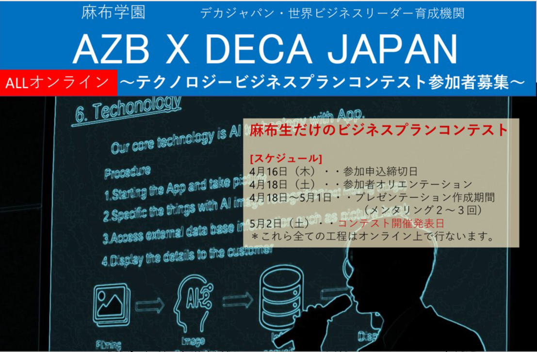 5/2開催 休校中の高校生に「ピンチをチャンスにする力」を授けるべく、アントレ(起業)教育を提供している「DECA JAPAN」が麻布高生とコラボし、オンラインコンテストを初開催します 「よりよき世界を実現したい」高校生たちの挑戦をサポートしている教育機関「DECA JAPAN」 (和歌山市)は、「麻布学園高校」(東京・港区)の生徒とタッグを組んだオンライン・ビジネ スプランコンテスト「AZB ×DECA JAPAN」を、2020年5月2日(土)にZoom開催します。