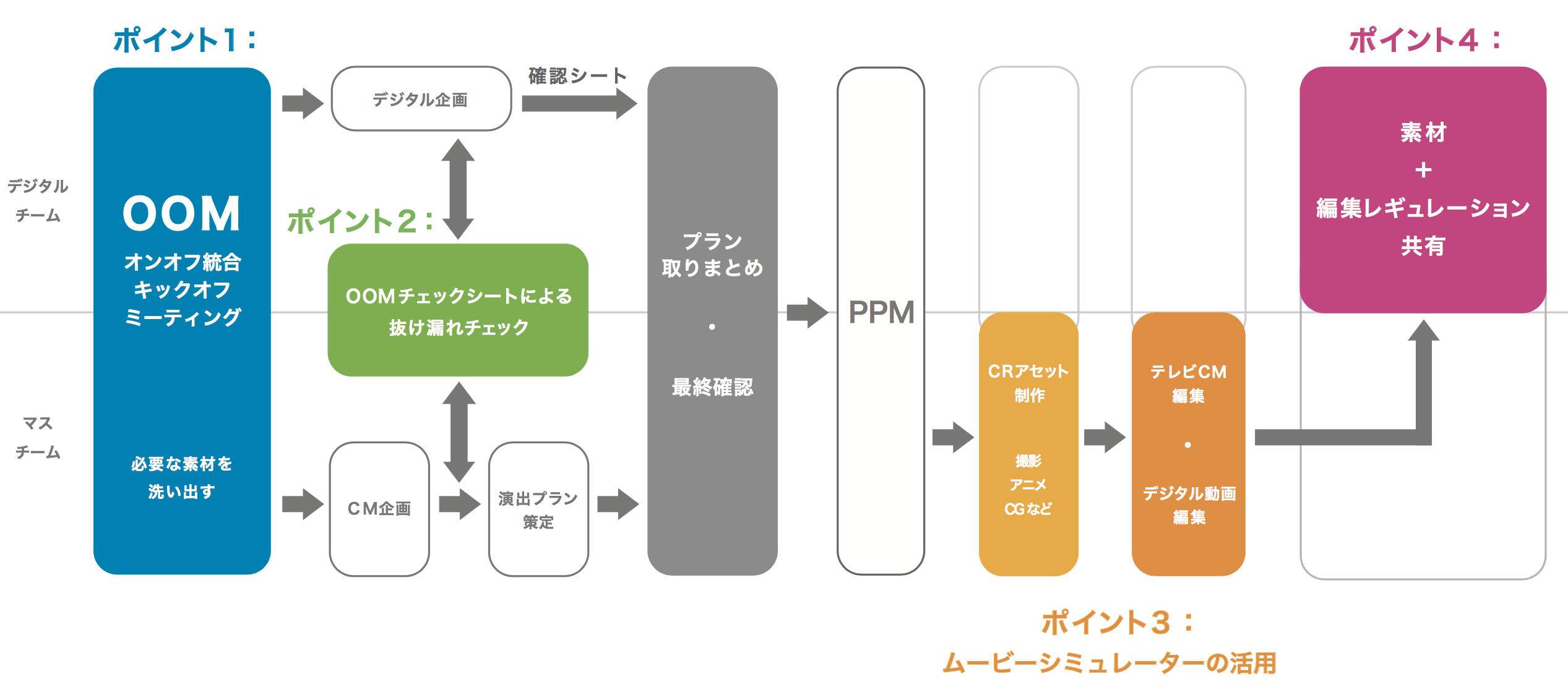 具体的には、オンオフ統合キックオフミーティング(OOM)を設定・定例化し、その際に双方で共有すべき項目・確認事項をチェックリスト化。デジタル広告とマス広告の連動・併用に必要な素材のパターンをあらかじめ想定します。また、映像・画像編集時にデジタルメディアでの再生時の見え方を事前に確認できる新ツール「ムービーシミュレーター」を開発・導入しました。これにより、オンオフ統合案件の業務全体の品質向上、サービス向上を実現することが可能となります。