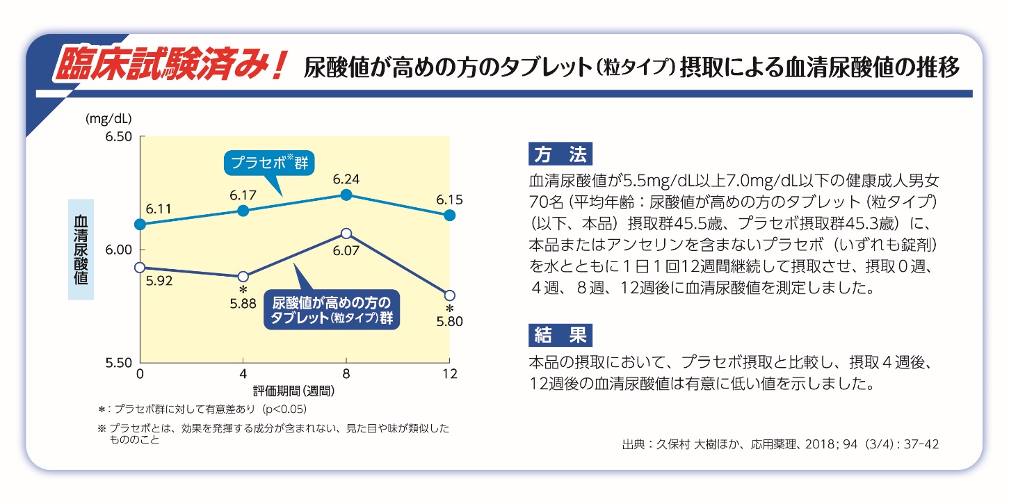 本品にはアンセリンが含まれるので、健康な方の高めの血清尿酸値(5.5~7.0mg/dL)を低下させる機能があります。血清尿酸値が高めの方に適した食品です。 |
