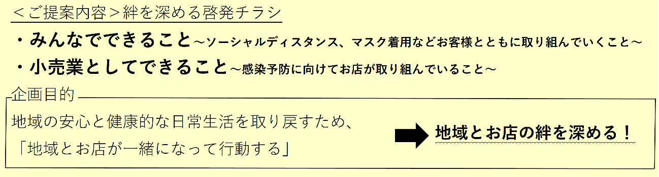 ■「思いやりのあるお買い物行動」が地域とお店の絆をつくるスーパーマーケットでは、新型コロナウイルス感染対策で人が集まることを避けるため、これまで集客のために活用されてきた折込チラシの自粛を余儀なくされております。店内の安全確保と商品の安定供給をしながらの営業活動に奔走している中で、折込チラシを通じて地域の皆さんへの思いやりのある買い物を呼びかけると同時に、安心してお買い物できるお店側の取組みを認知していただきます。これらの働きかけによって、地域のお客様とお店の絆を深め、新型コロナ収束後のエンゲージメントを高めていくことが期待できます。