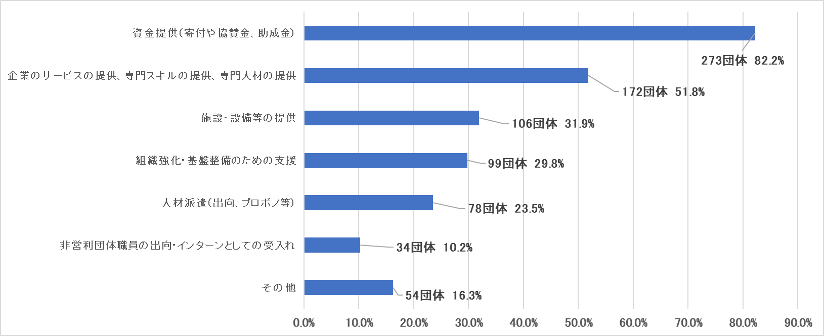 ■非営利団体が期待する企業の社会貢献活動として、「資金提供」が80%を占め、「企業独自のサービスや専門スキルの提供」、「施設・設備等の提供」と続き、幅広い支援が求められている。