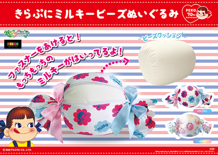 また、「ミルキー」をビッグサイズで表現し、ファスナーを開けるとやわらかビーズでできたミルキーが取り出せる「きらぷにミルキービーズぬいぐるみ」と、ロングセラーブランド「レモンスカッシュ」「ネクター」缶飲料をビッグサイズで表現し、ファスナーを開けるとドリンクが保冷できる実用雑貨「不二家ドリンククーラーバッグ」の計4アイテムを同時に展開いたします。