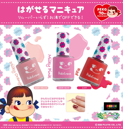株式会社イオンファンタジー(本社:千葉県千葉市、代表取締役社長:藤原信幸、以下、当社)は、ペコちゃん生誕70周年を記念し、株式会社不二家の商品ブランド「ミルキー」「レモンスカッシュ」「ネクター」とのコラボレーションによるプライズゲーム用景品「PekoCosmeシリーズ はがせるマニキュア」「PekoCosmeシリーズ パフ型miniポーチ」「きらぷにミルキービーズぬいぐるみ」「不二家ドリンククーラーバッグ」を2020年7月10日(金)から当社が運営する全国のアミューズメント施設「モーリーファンタジー」「PALO」とオンラインクレーンゲーム「モーリーオンライン」限定で展開いたします。