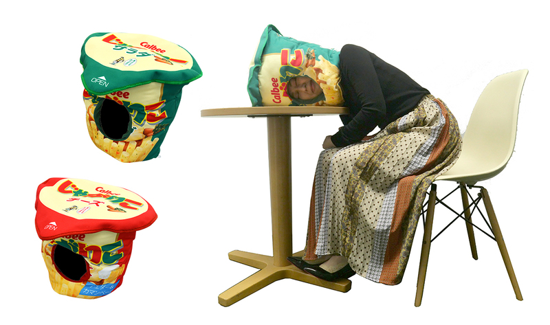 「じゃがりこ被り物」は、「じゃがりこ」パッケージと同じデザインの被り物です。クッションのような被りごこちの「じゃがりこ被り物」を頭にかぶって顔を出せば、まるで「じゃがりこ」そのものになったかのよう。「サラダ」「チーズ」の2種類展開です。