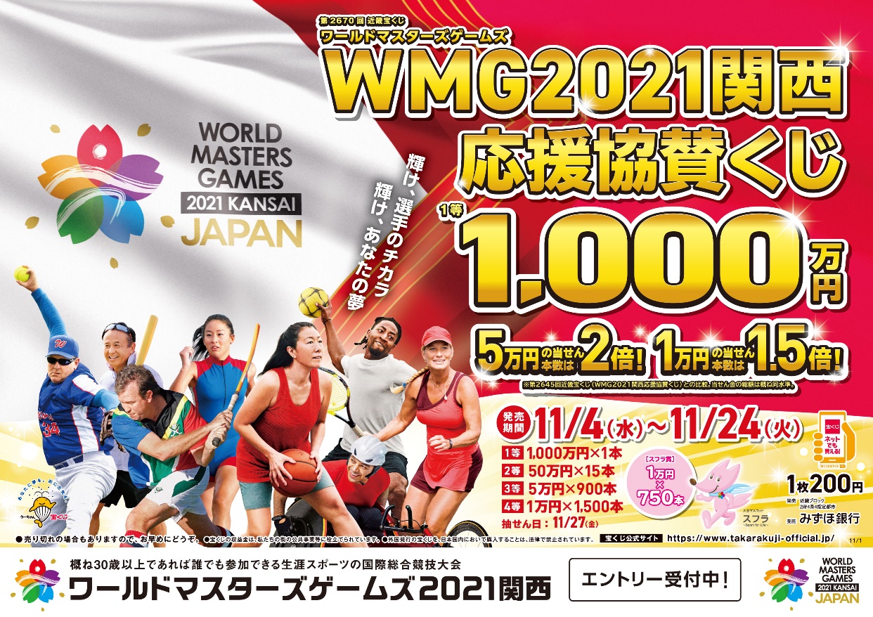 「WMG2021関西」は、概ね30歳以上であれば誰でも参加できる生涯スポーツの国際総合競技大会です。「WMG2021関西応援協賛くじ」は、大会に出場する選手の挑戦を応援するために2017年度から販売を開始し、今回で4回目になります。収益金の一部は、WMG2021関西の準備および運営に役立てられます。