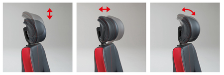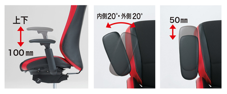 可動ヘッドレスト付き、シンクロリクライニング機構付き、座面の高さ・肘(3D)の調整が可能