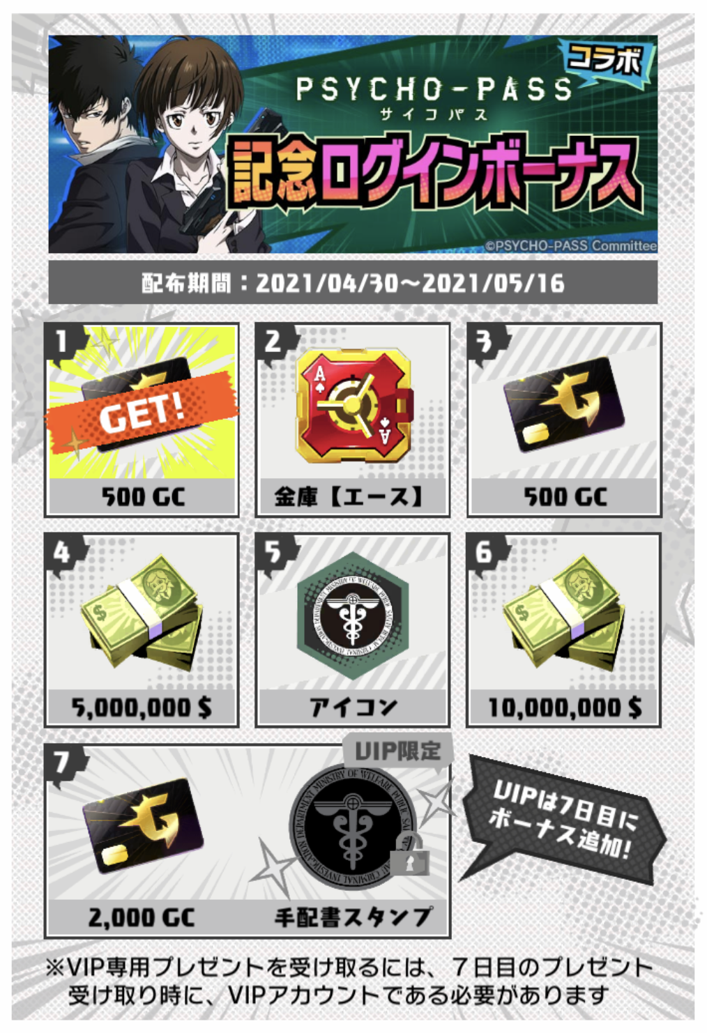 ※VIP専用プレゼントを受け取るには、7日目のプレゼント受け取り時に、VIPアカウントである必要があります。