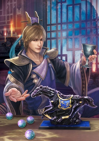 主君曹操の愛馬「絶影」の酒ボトルと共に美酒を味わう郭嘉