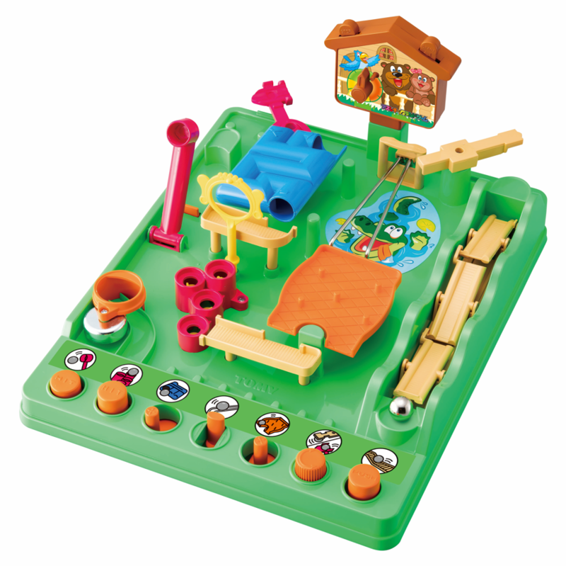 「アスレチックランドゲーム」は“アスレチックフィールド”にボールをセットし、ボタンの簡単な操作でボールを動かしながら8つのアスレチックを乗り越えていく、指先を使ったハラハラドキドキのエキサイティングアクションゲームです。タイマー機能を備え、試行錯誤しながら制限時間内にゴールまで集中して進む達成感が快感となり、何度も遊びたくなる商品です。
