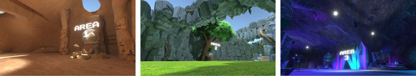 コア空間から移動できる大きな3つの横穴。砂の洞窟、光と緑に満ちた峡谷、鉱石輝く地下渓谷と、それぞれ異なった様相になっています。中ではさまざまな出展社・協賛社の展示を楽しむことができ、最新のゲーム情報を入手したり、TGSVR2022でしか見ることのできないブースやモニュメントを眺めたりすることができます。