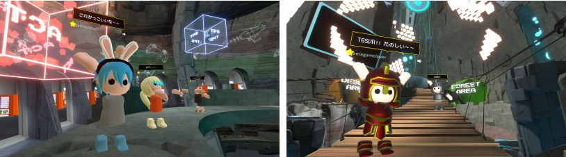 TGSVR2022の会場は、今年TGSが開催される幕張メッセの地下に広がるダンジョンです。からっぽの幕張メッセの床に空いた大きな穴をエレベーターで下ると、突如出現する巨大な地下空間。そこには長い間にゲームの記憶が堆積された「ゲームの地層」が現れています。TGSVR2022の来場者は東京ゲームショウを楽しむと同時に、「ゲームの地層」を探検するプレイヤーとして、クエストをクリアしながら会場内を探索することが可能です。