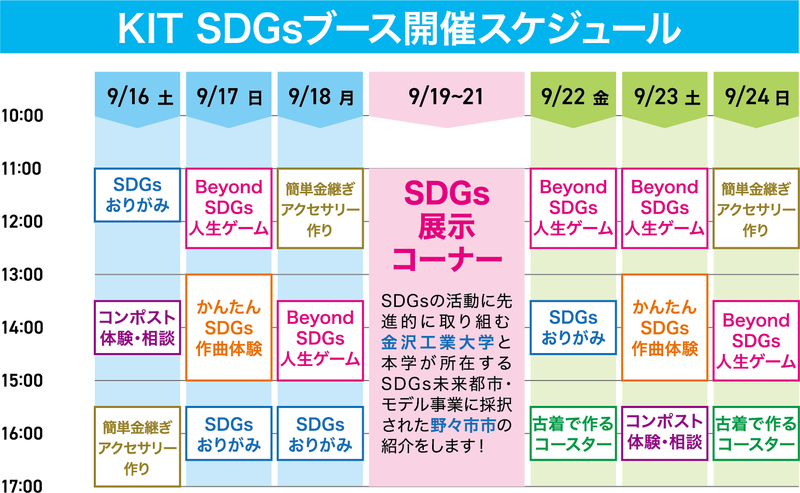 期間中、上記ワークショップやブースで使用するSDGsゲーム教材や書籍、体験キットなどを販売するほか、SDGsを学ぶためのゲーム教材を活用した授業・研修に関する相談ブースを設置します。また、金沢工業大学の学部・学科および入学案内に関する冊子の配布のほか、本学所在地であり、内閣府から2023年度の「SDGs未来都市」および「SDGsモデル事業」を実施する自治体として選定された野々市の紹介パネル展示も行う予定です。