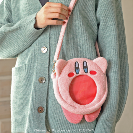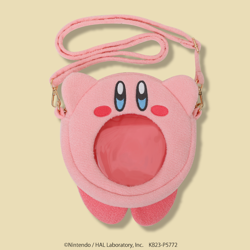 すいこみポーズのカービィが、ふわふわのポシェットになりました。口部分が透明素材になっており、中身が一目で