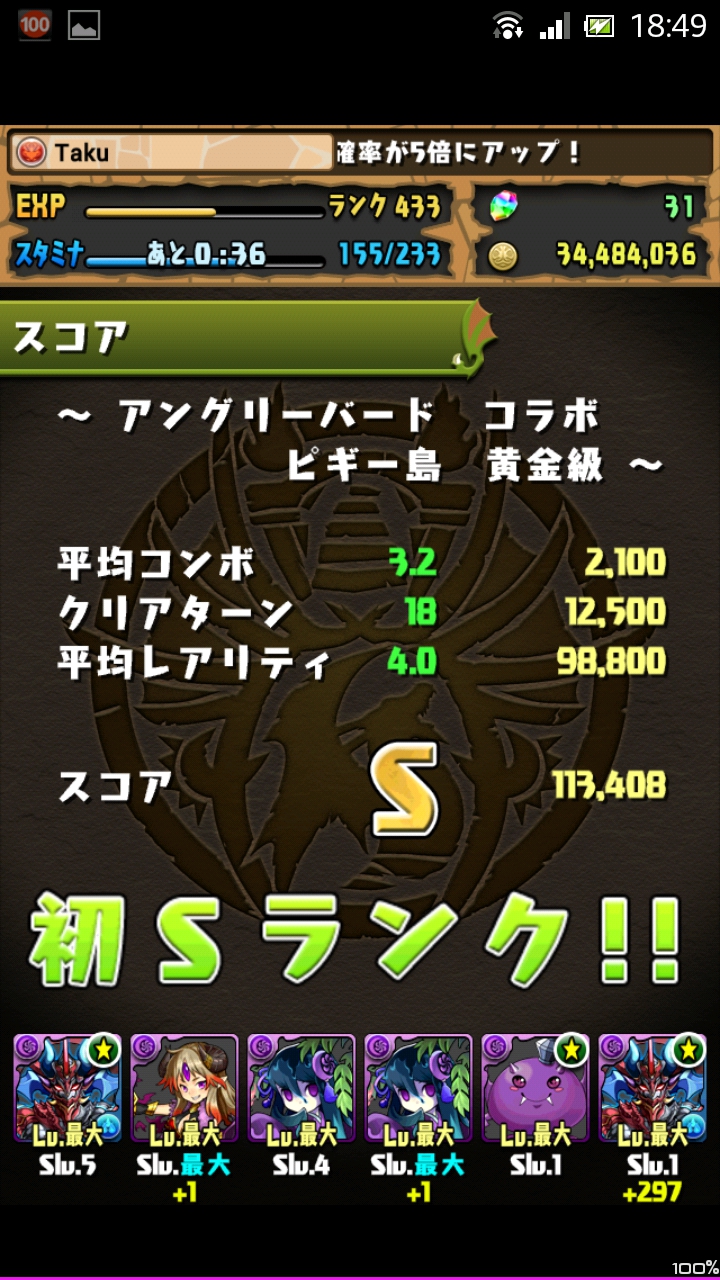 今回のボーダーラインは9万点なので、この編成ならレアリティで98000点が取れるので確定でSランクです。