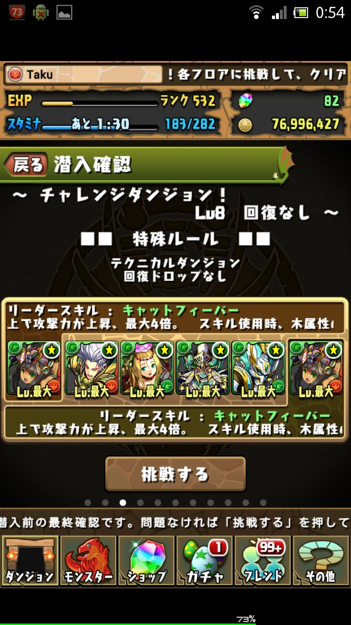 今回は覚醒バステトパで挑戦。覚醒セレスパで耐久するのもいいですが、やはり早く終わらせたい場合は覚醒バステトでガンガン突き進むのがよさそうです。