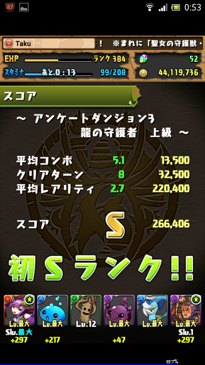 ということで無事にSランクです。レアリティだけで22万点を超えてるので、クリアすればほぼ確実にSランクが狙えます。