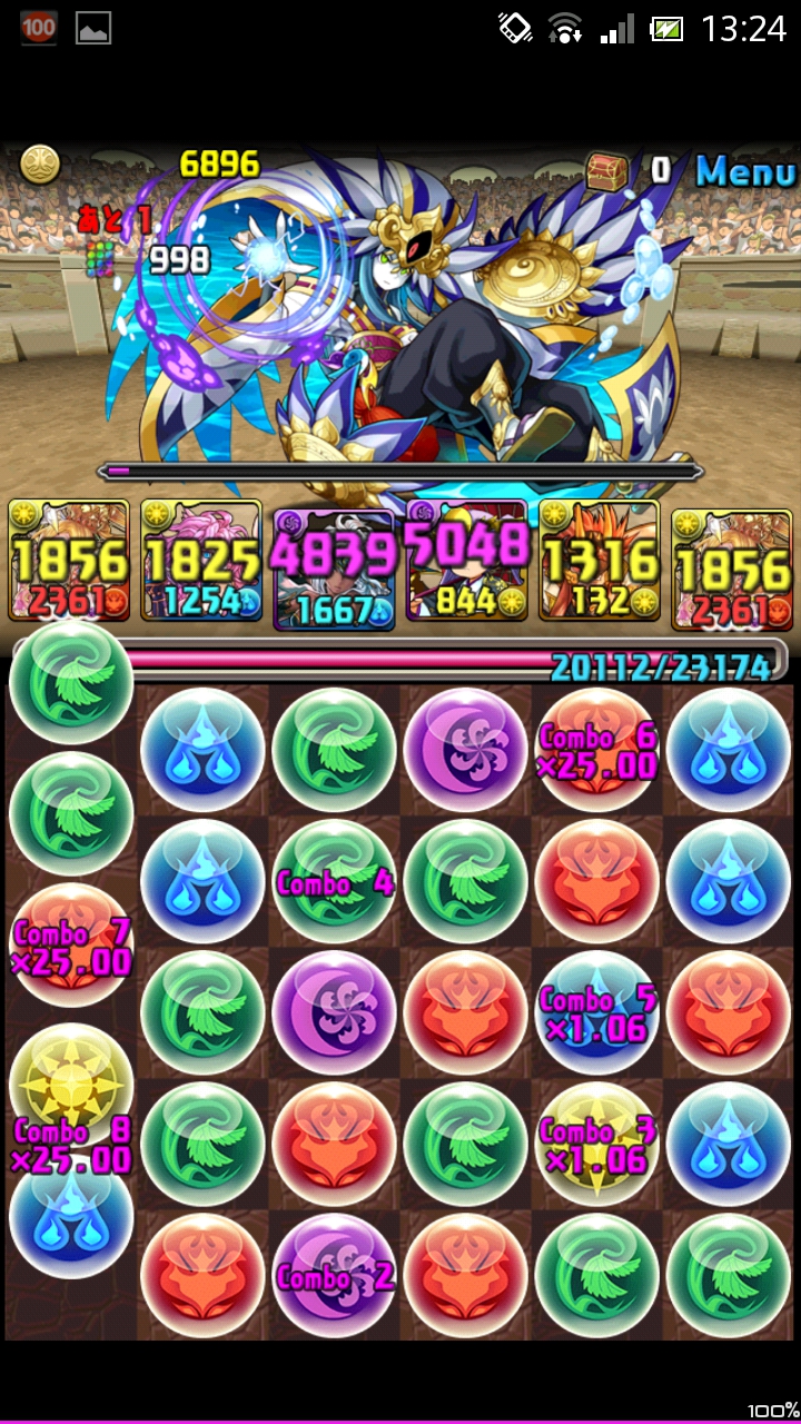 ヒカーリーのスキル⇒小太郎の変換で、光多めの4色盤面に。あとはチェンジザワールドを使って盤面最大コンボを組むだけ。操作時間が減らされているので、ヨミのチェンジザワールドがかなり役立ちました。