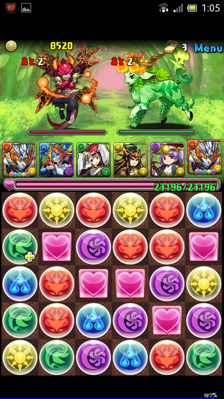 盤面に5色ない場合は盤面整理しながら殴りあいます。火をお邪魔に変える攻撃をしてきますが、逆にお邪魔を火に変える攻撃もしてくるのでそこまで気にしなくてもいいです。