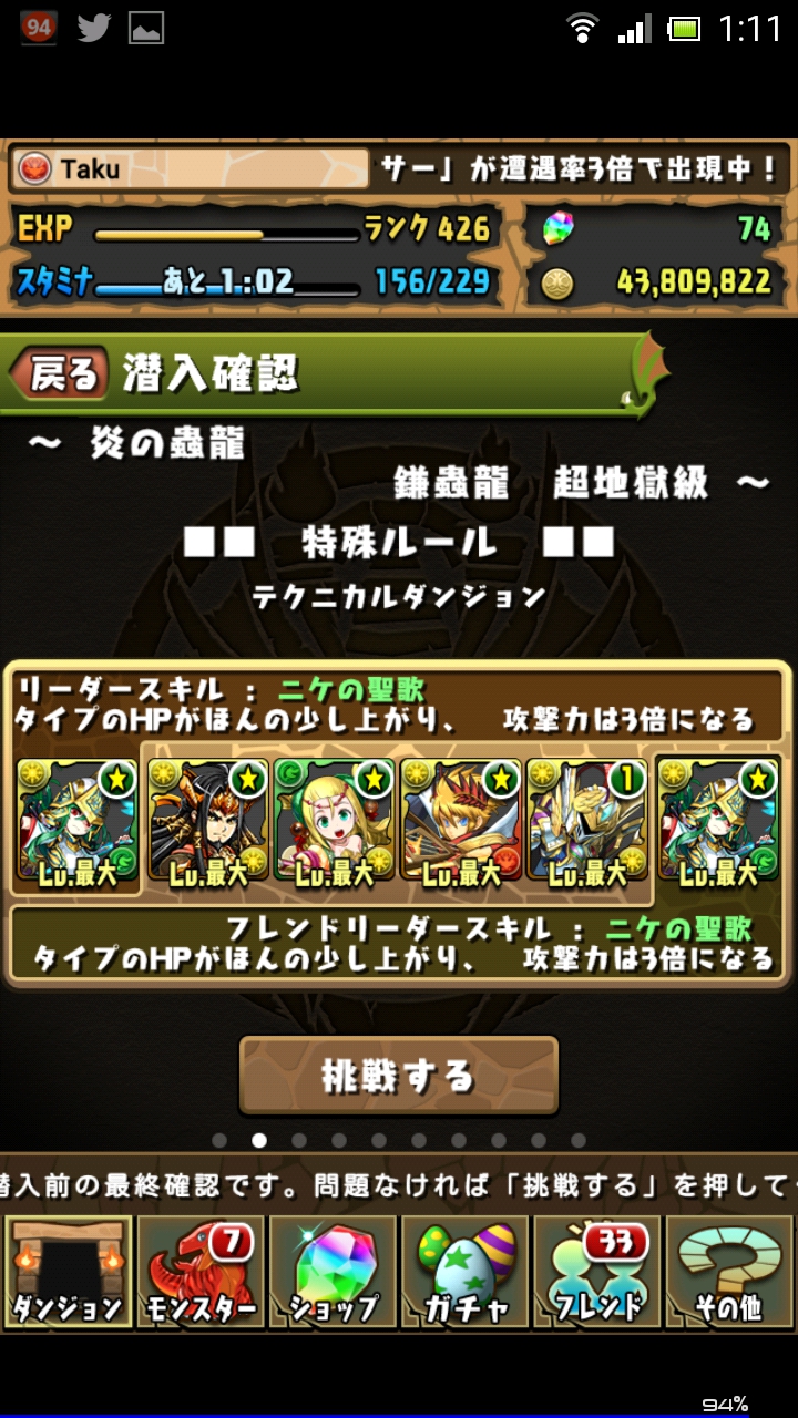 今回挑むのはアテナパです。常時攻撃力9倍、さらにHPも上がるためかなりHPに余裕が生まれます。瞬間火力も早めのターンで出せるため、雑魚の攻撃力が高く階層も少し短いこのダンジョンには相性がいいと思われます。