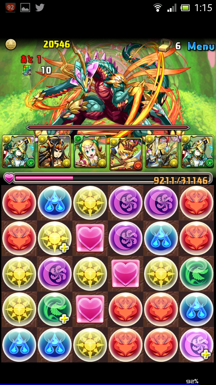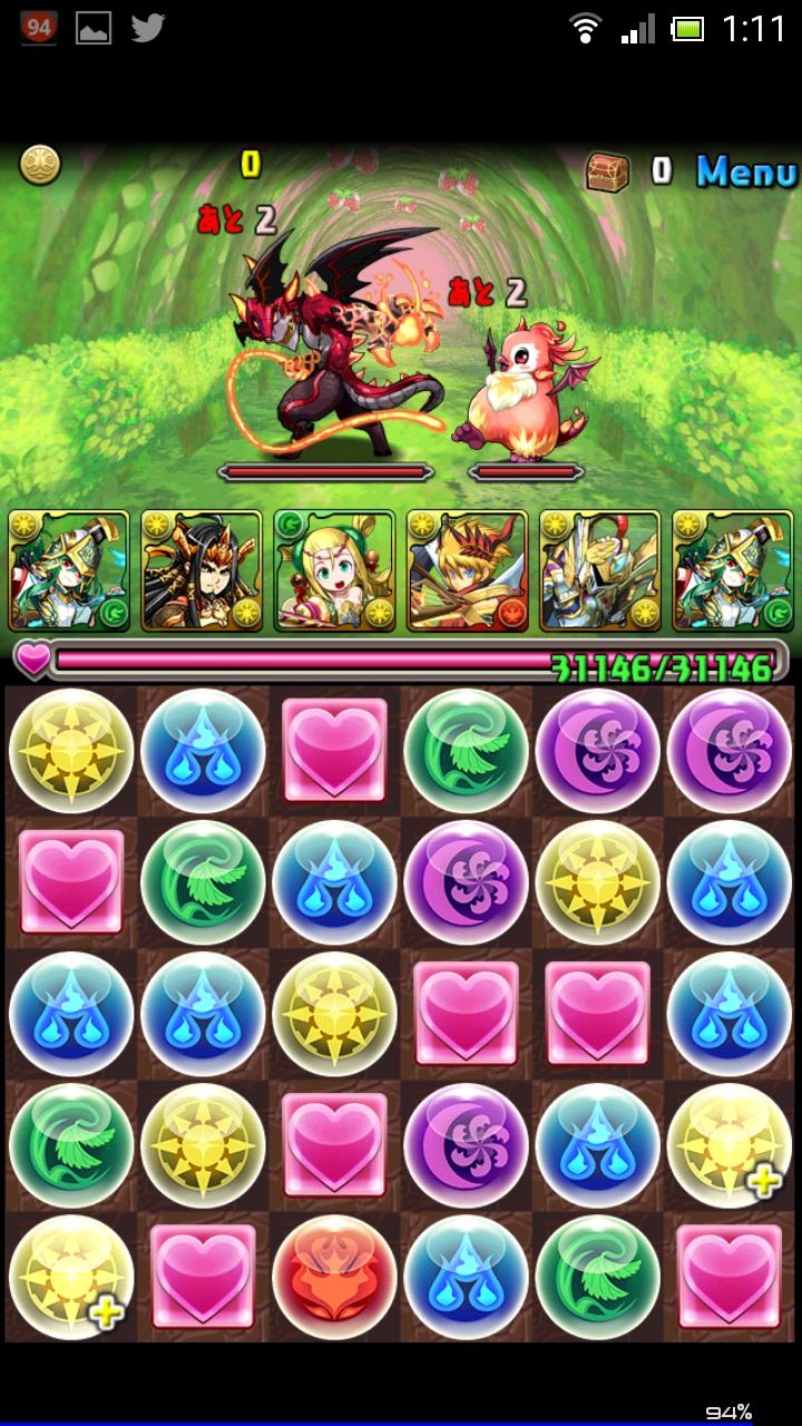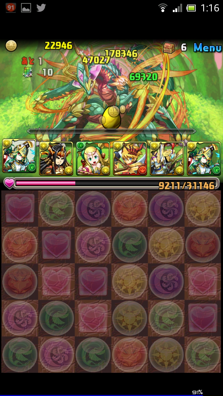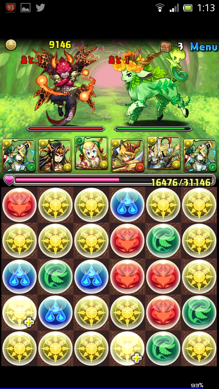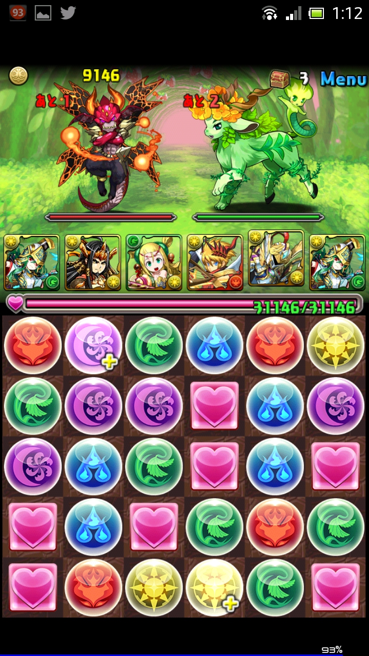 お決まりのメイメイ⇒ヴァーチェの変換で光多めの光木2色盤面に。あとはイザナギの神エンハで攻撃2倍、さらにアテナのドロ強化で光と木を強化。あとは4つ消しを含めて普通に消すだけ。