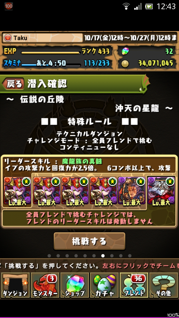 今回は、新たに実装された「伝説の丘陵」のチャレンジモードに挑戦したいと思います。チャレンジモードはコンテ不可、リーダースキルは自分のモンスターのみ、あとはフレンドといった難しい条件付きとなっています。
