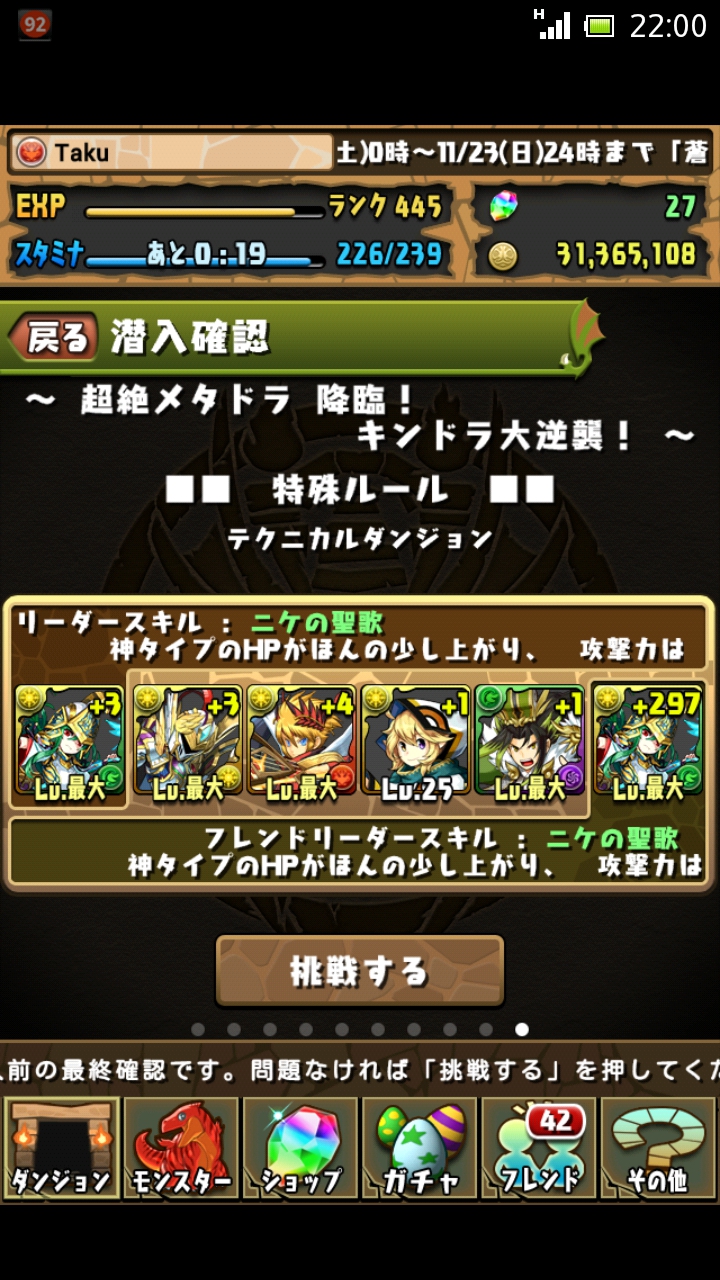 今回は、先日初実装された「超絶メタドラ降臨!」に挑戦してみたいと思います。このダンジョンでは、今後実装予定である究極ヴァルキリーの更なる進化に必要な素材「超絶メタルドラゴン」がドロップするゲリラダンジョンとなっています。