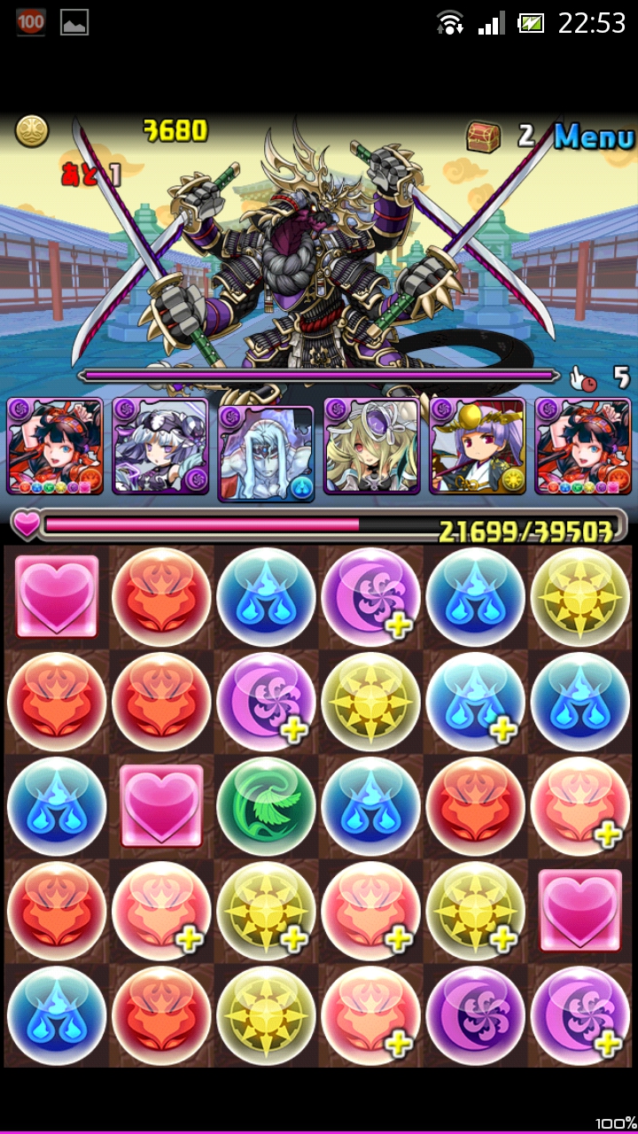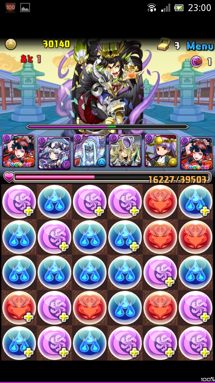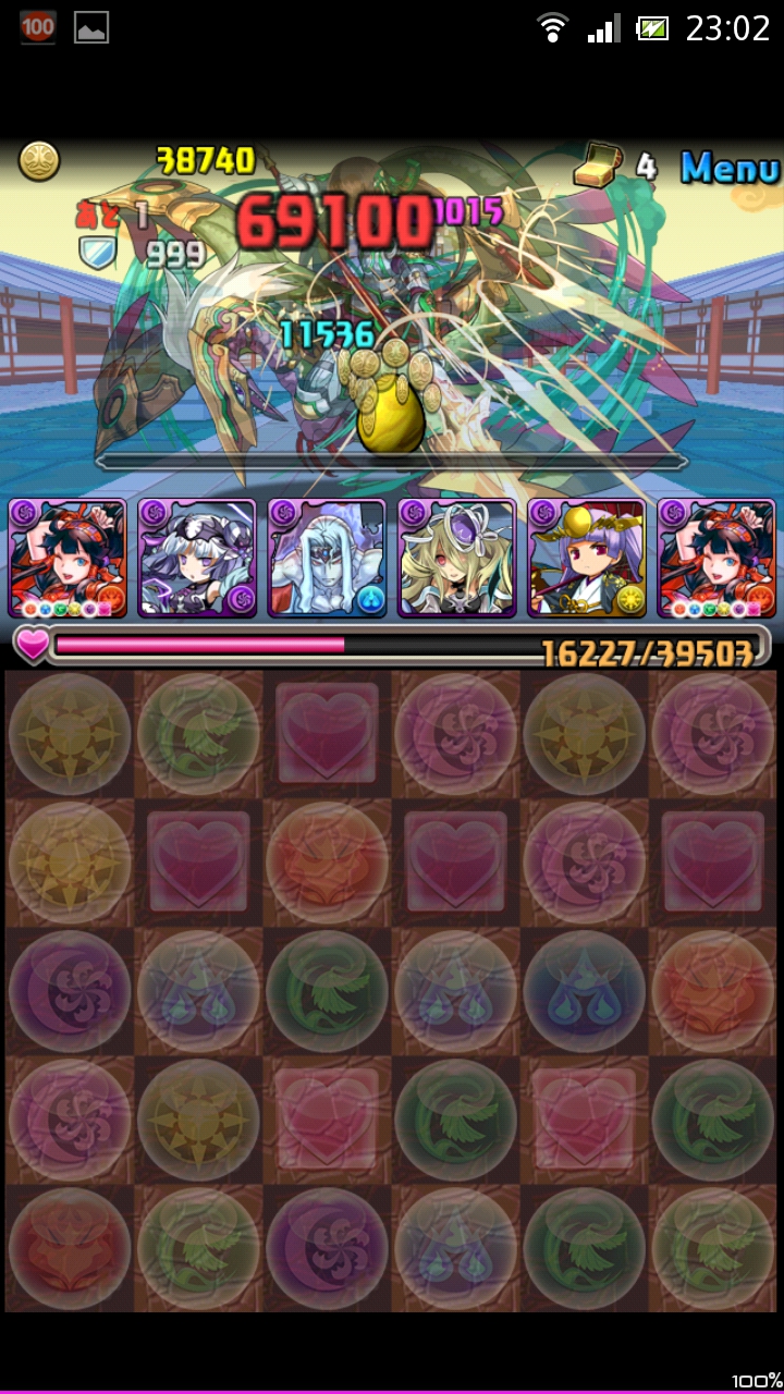 3階、ドラゴンショウグンです。HP約208万。先制で5ターンの間ドロップ移動時間が1秒短くなります。操作時間延長なしだと3秒しか動かせないので注意。ヨミなどを入れると相殺できますね。