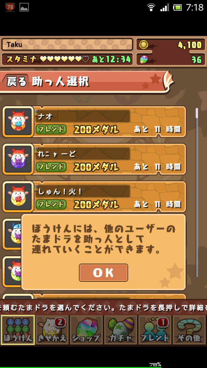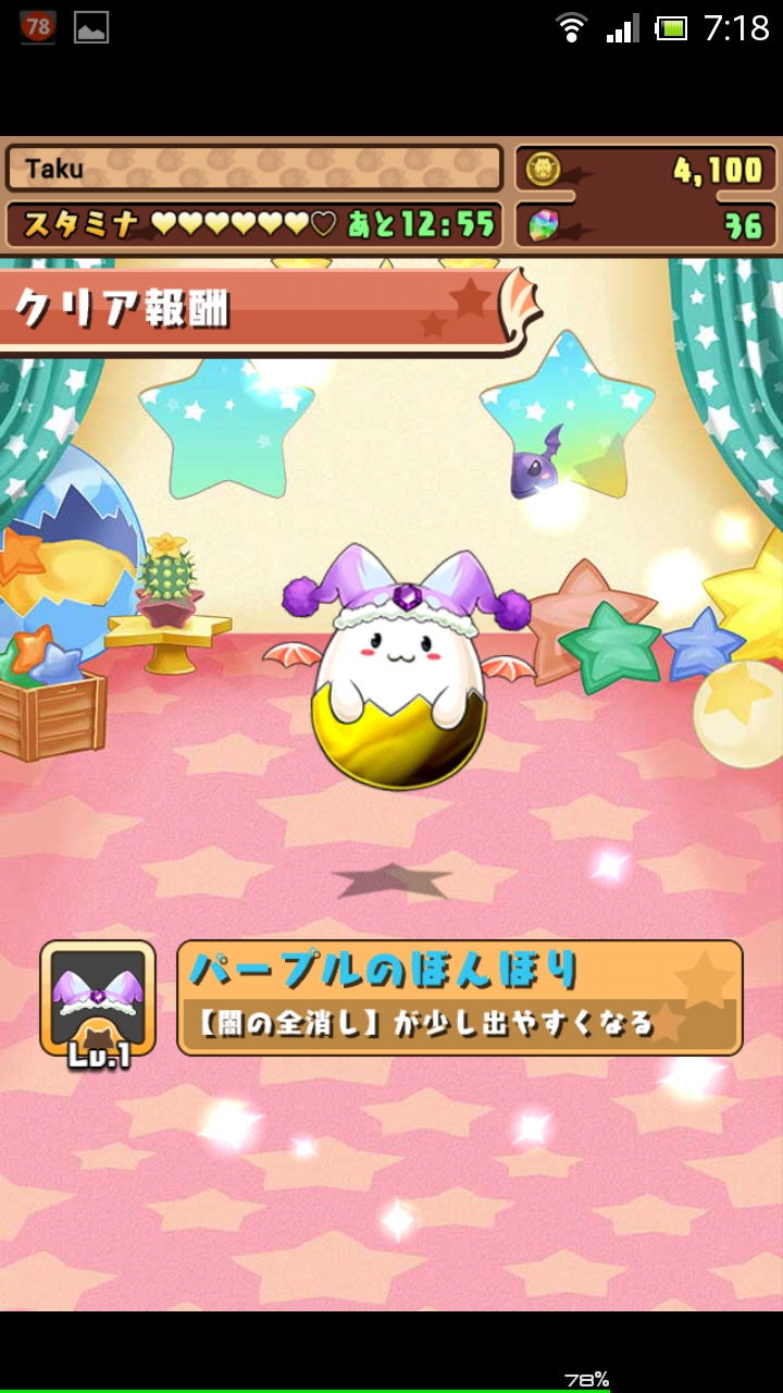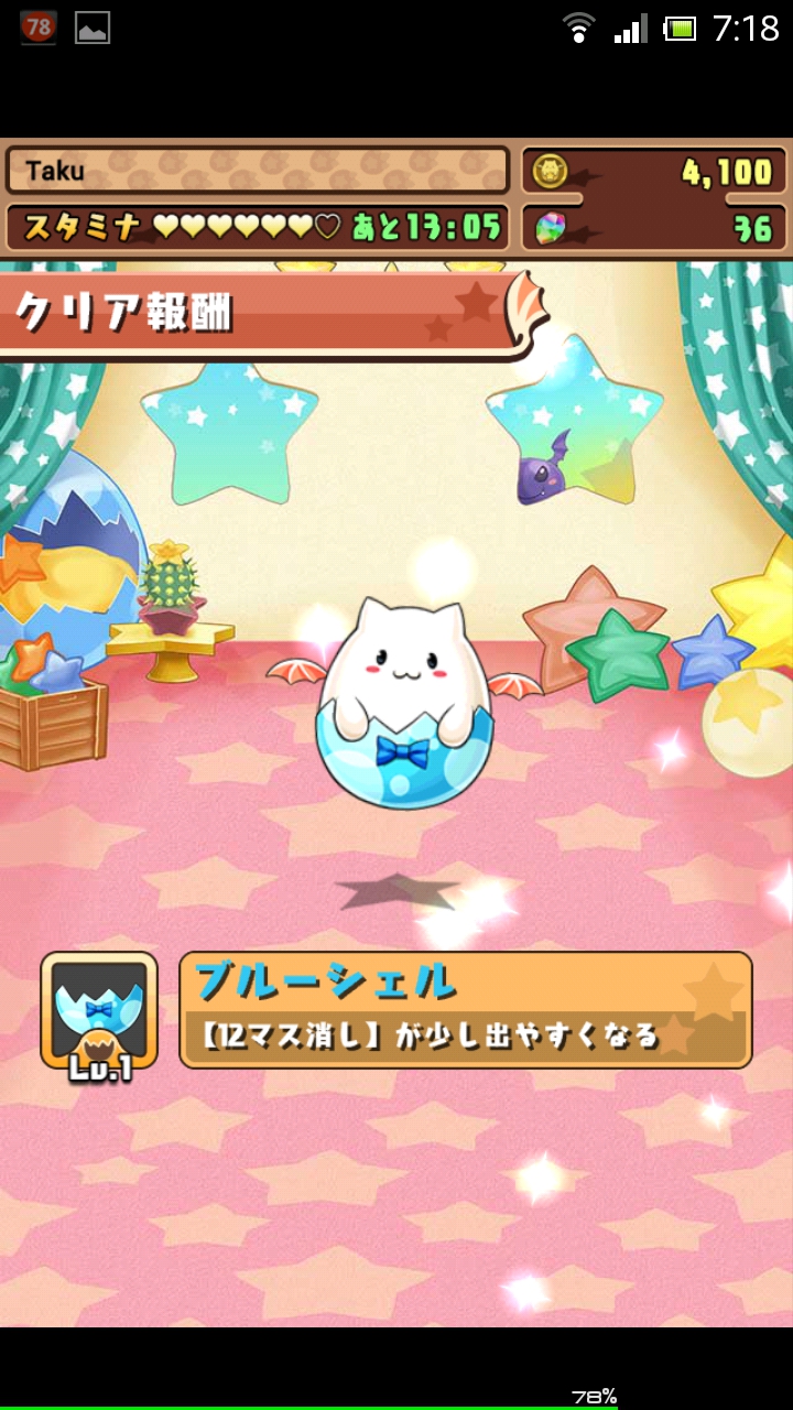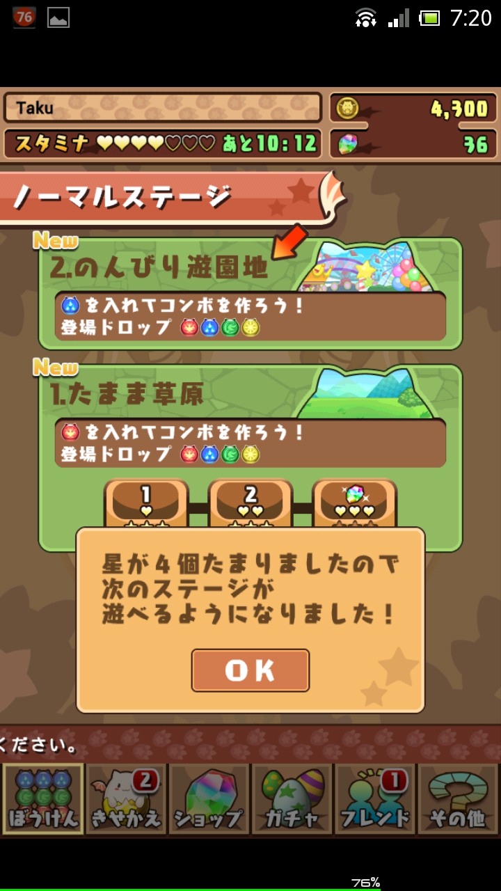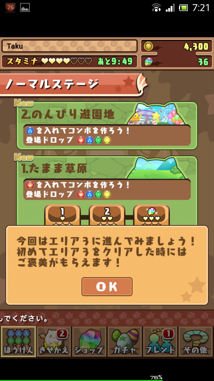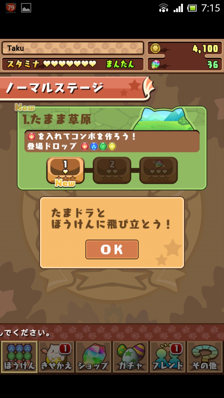 ではドンドン進んでいきましょう。スタミナは15分で1回復、ハート制になっています。最大で7個あるようで、結構こまめにやらないとスタミナが溢れそうです。