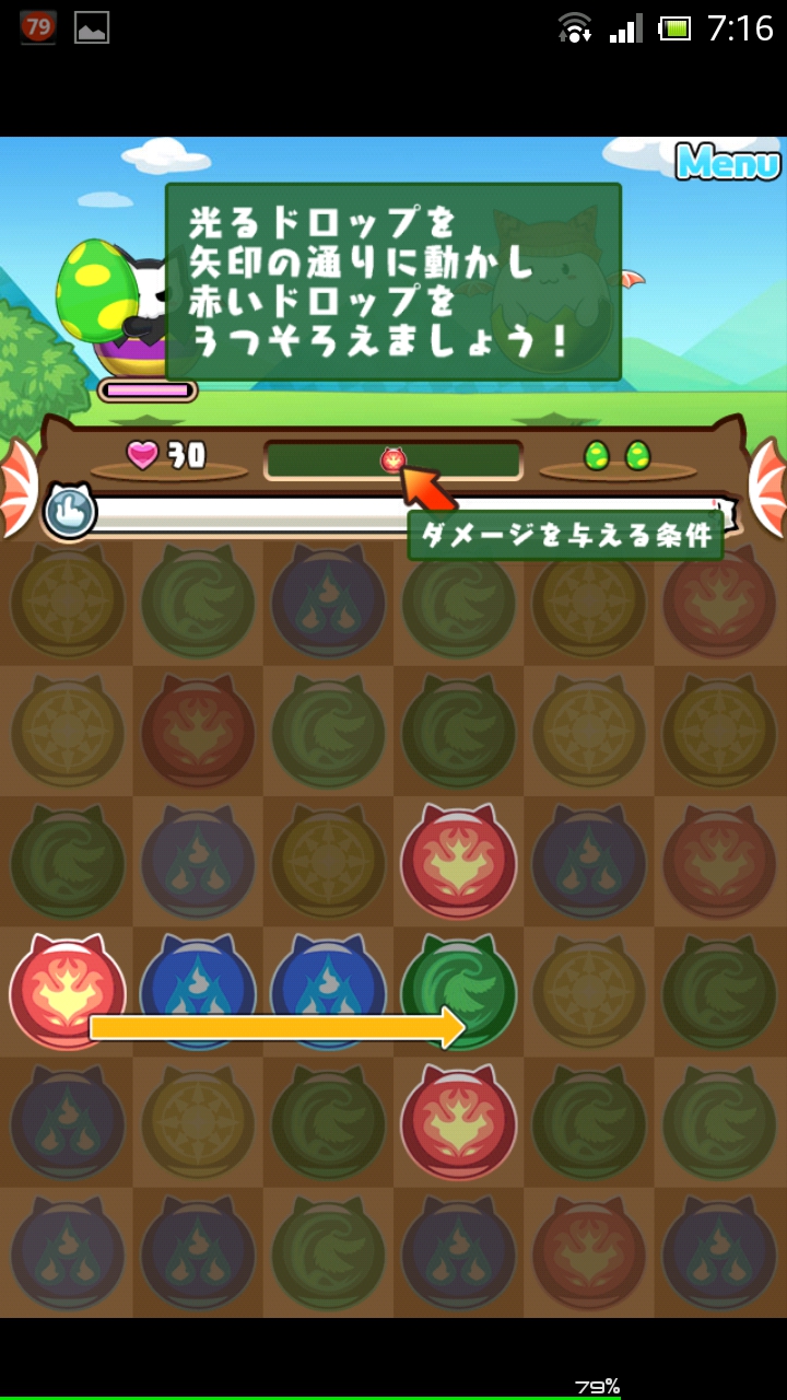 1回のパズルでそれを達成すると、敵に攻撃が出来ます。ちなみに攻撃力はたまドラに依存するわけではなく、コンボ数がそのままダメージとなります。条件を満たしながら10コンボすれば、敵に10ダメージ与えます。